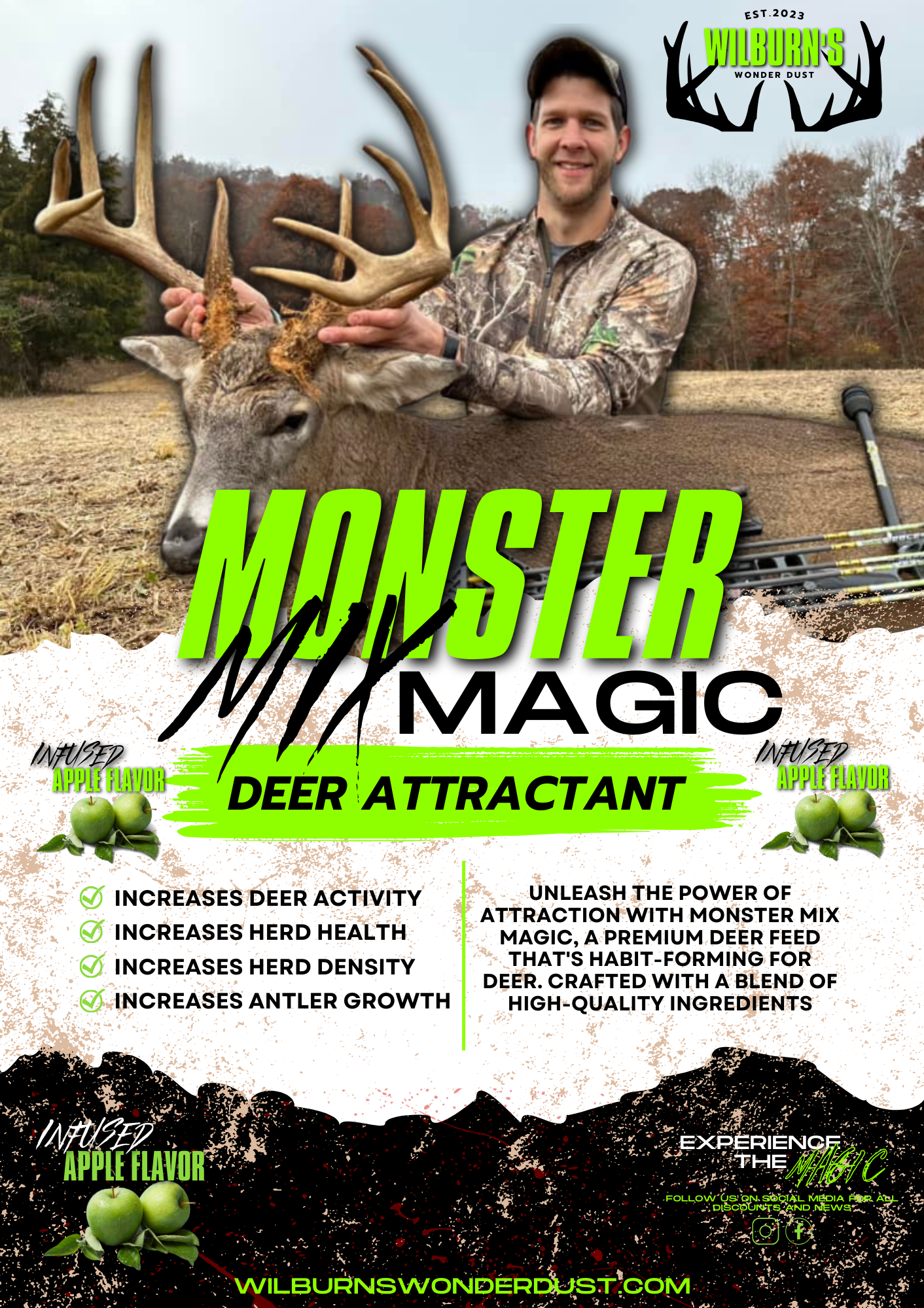 Introducing Monster Mix Magic, now in a captivating Apple flavor. This revolutionary deer attractant enhances deer activity in your hunting or viewing area. The alluring apple scent effectively entices and engages deer.